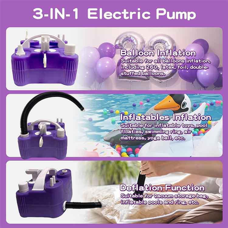 Šis elektrinis baliono siurblys siūlo keturias funkcijas vienoje. Tai yra ne tik efektyvus baliono pripūtiklis, bet ir ypač greitas pripučiamų žaislų/namų apyvokos daiktų, intelektualus vakuuminis siurblys, skirtas vakuuminių laikymo krepšiams, ir profesionalus oro siurblys sportiniams rutuliams. Nuo vakarėlių dekoravimo iki lauko kempingų, nuo namų saugyklos iki sporto ir kūno rengybos, vienas įrenginys apima visus scenos poreikius, taupant erdvę ir taupant biudžetą.