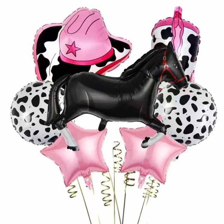 Kaubojų tematikos folijos balionai yra dekoratyvinis nešiklis, įkūnijantis simbolinius Vakarų kaubojų kultūros elementus. Dėl savo unikalių stiliaus savybių ir scenos suderinamumo jie tapo pagrindiniu elementu, perteikiančiu nostalgišką atmosferą ir džiugią nuotaiką įvairiuose teminiuose renginiuose. Tai ne tik aliuminio folijos balionų formos dizainas, bet ir meninė klasikinių kaubojiškos kultūros simbolių transformacija. Vaizdinės raiškos ir emocinio perteikimo prasme užmezga ryšį su vakarietiška dvasia, tenkina dekoratyvinius poreikius ir įkūnija laisvą ir nevaržomą požiūrį į gyvenimą.