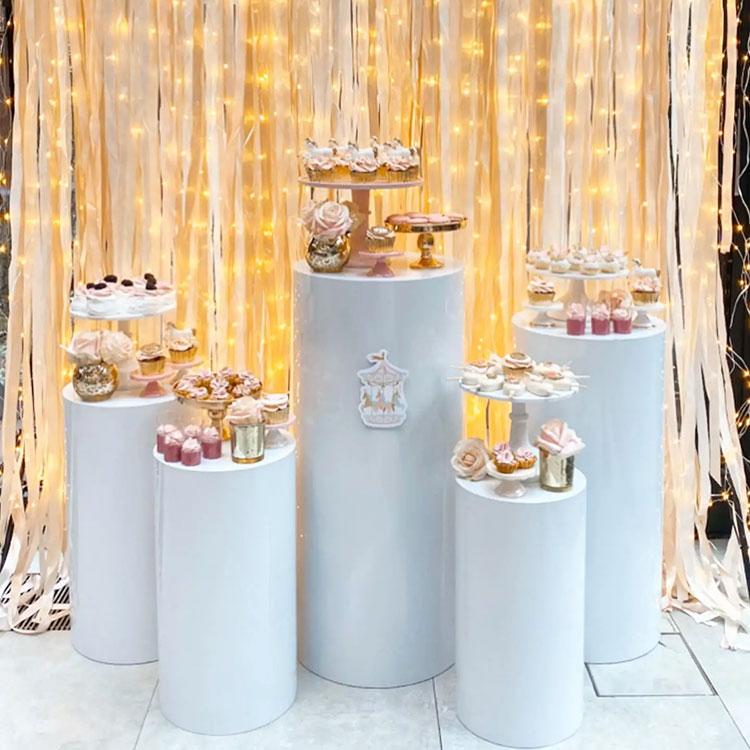 Cilindrinis desertų stalas gali būti naudojamas vakarėliuose, vestuvėse, gimtadienio renginiuose, o įmonės taip pat gali juos naudoti meno kūriniams, gėlėms, papuošalams ir pan.