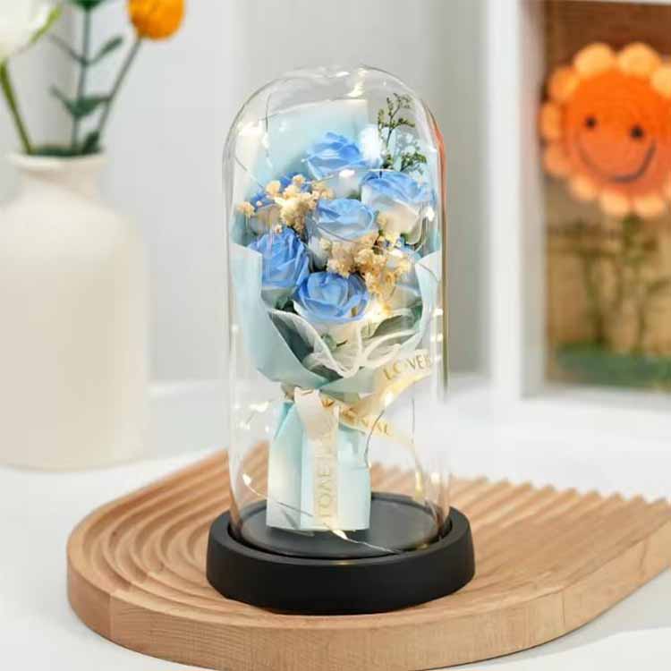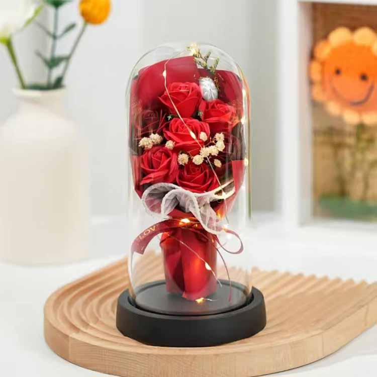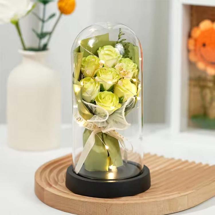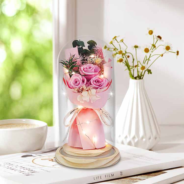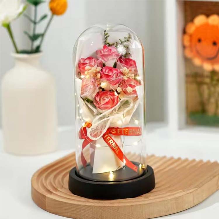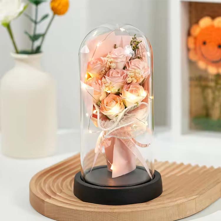 Stiklinio kupolo muilo rožių puokštė su LED naudojama kartu su muilo gėlėmis ir konservuotomis gėlėmis.LED šviestuvuose naudojama šilta ir nešviečianti šviesa, kuri dekoruojant scenas gali sukurti šiltą atmosferą. Integruotoje LED šviesos eilutėje taip pat yra spalvingų mirksinčių lempučių, o spalvas galima pritaikyti pagal jūsų poreikius. Ši puokštė su stikliniu dangteliu taip pat gali būti naudojama rengiant scenas, gimtadienius, pasiūlymus ir kt. būti suteiktas kaip a dovana.Amžinai gėlės nenuvys ir nepakeis spalvos net su stikliniu gaubtu. Muilo gėlės taip pat gali būti naudojamos rankoms plauti arba kaip kvapas. Ši rožių puokštė yra ekonomiška ir praktiška.