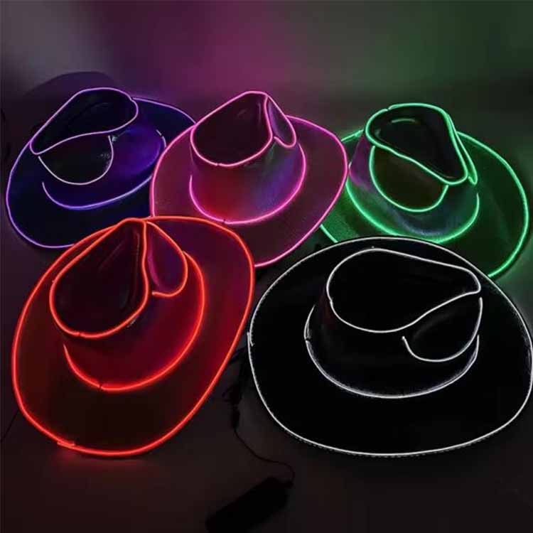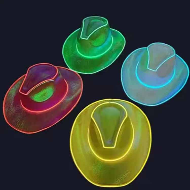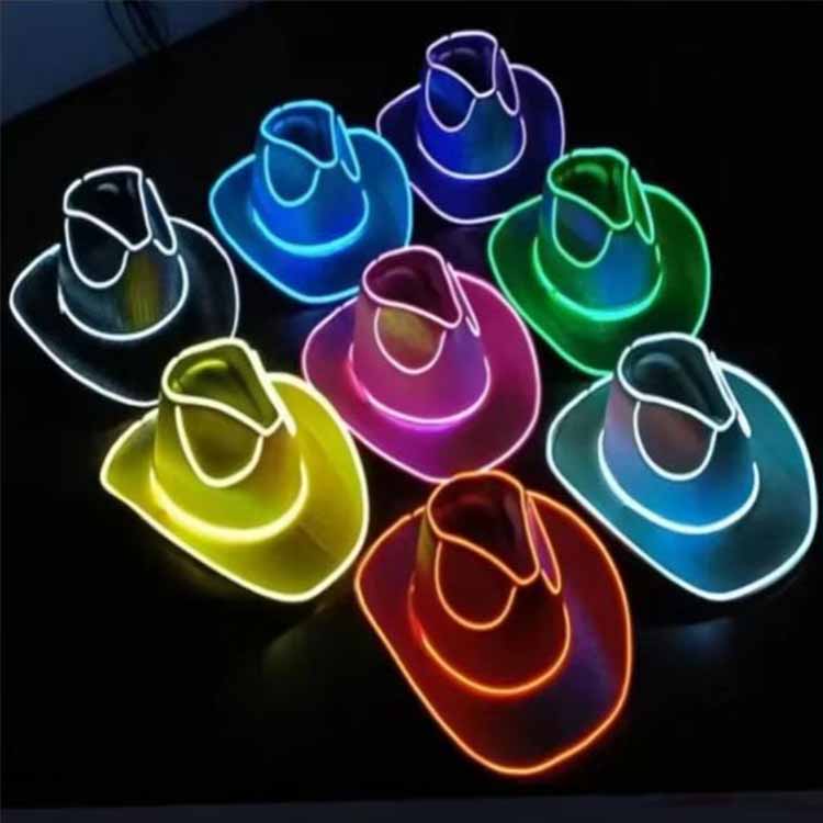 Šią LED fluorescencinę spalvingą skrybėlę lengva naudoti ir ją galima lengvai sumontuoti vos per 5 minutes. Tiesiog įdėkite dvi AA baterijas, įjunkite jungiklį ir mėgaukitės šviečiančios kaubojiškos skrybėlės linksmybėmis.