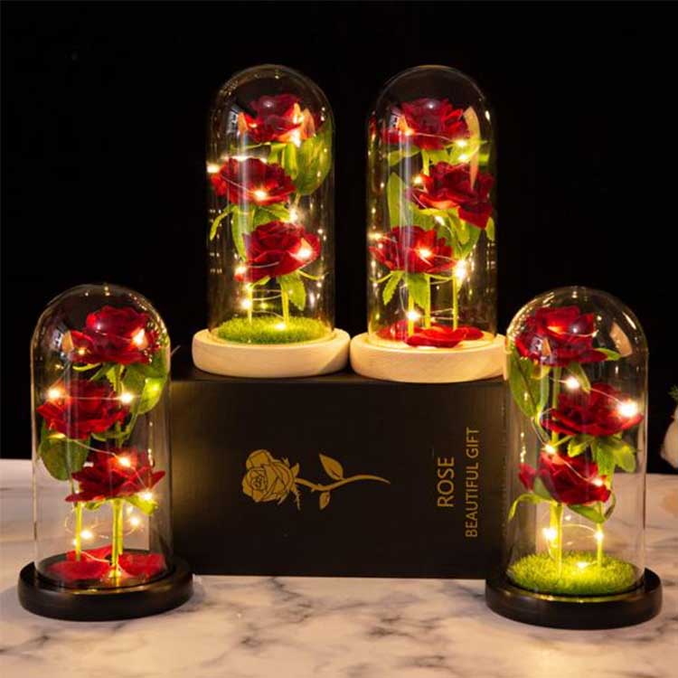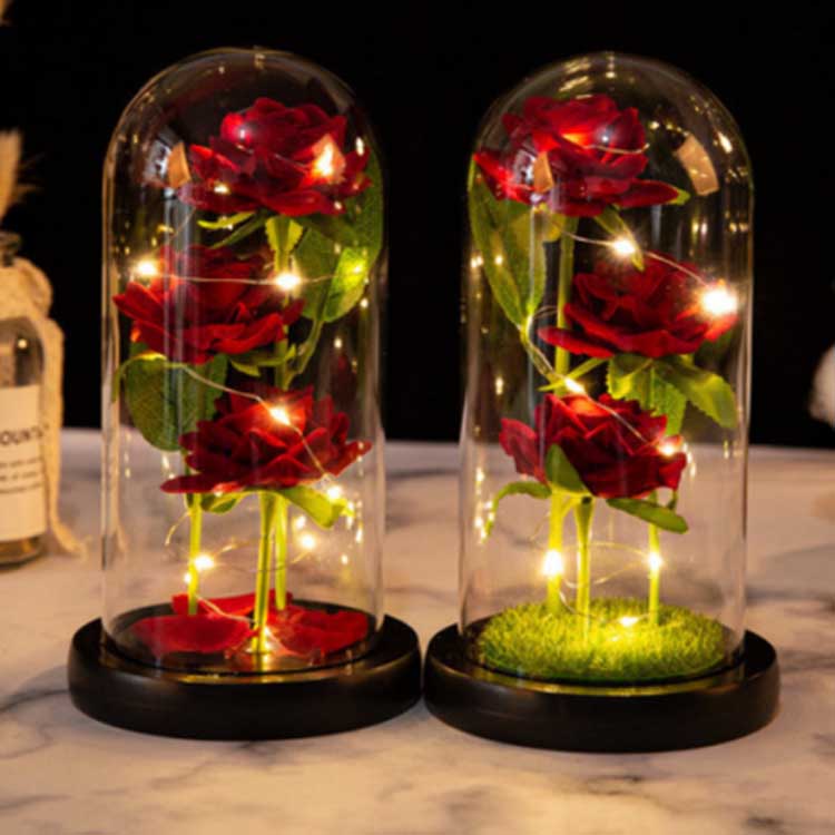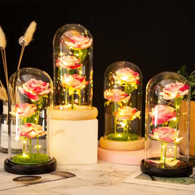 Rožinio stiklo kupolo viduje yra trys išsaugotos gėlės, išdėstytos skirtinguose aukščiuose, tikroviškais stiebais ir žaliais lapais. Stiklo dangtelis yra atsparus karščiui ir lengvai nepažeidžiamas. Šviesos diodų styginiuose yra įmontuotas minkštas apšvietimas, o jungiklis yra po mediniu pagrindu, kad būtų patogu valdyti. Tinka naudoti vestuvių dekoravimui ir namų apstatymui, taip pat gali būti įteikiamas kaip individualus stiklo rinkinys, jubiliejinė dovana arba gimtadienio dovana.